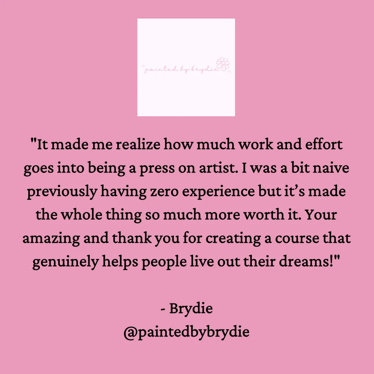 During the program I enjoyed getting to connect with other press on artists and felt inspired as we cheered each other on. I also really LOVED the group coaching calls with Chloe because it was so personable and you can tell that education is one of Chloe’s passions. As a former teacher I am thankful for Chloe using her knowledge to empower other women who want to break into this industry.