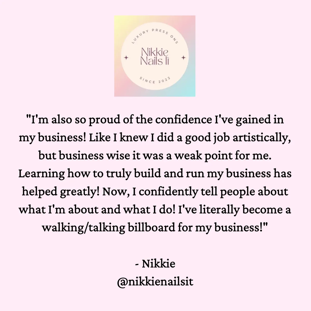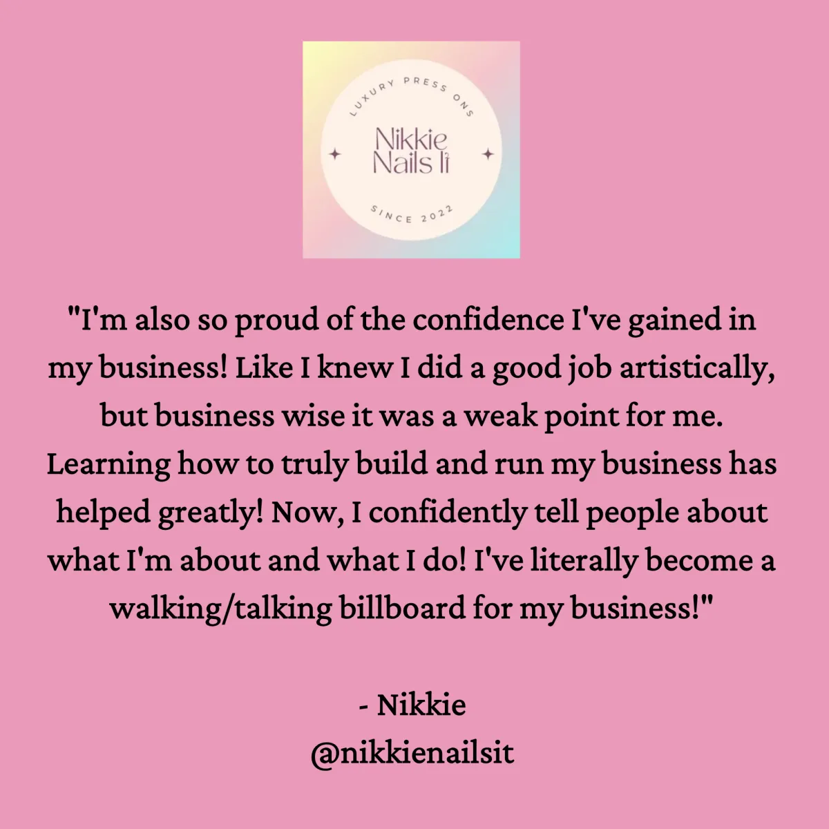 “So, the program was absolutely amazing. It helped me set myself up for success…[Launch Your Luxury Press On Brand] helped me set my business up successfully. It gave me the foundation that I needed. And the work it provided, like the social media and the email marketing helped me to get the clients…Even if it’s out of your comfort zone. I promise it’ll be worth it.”